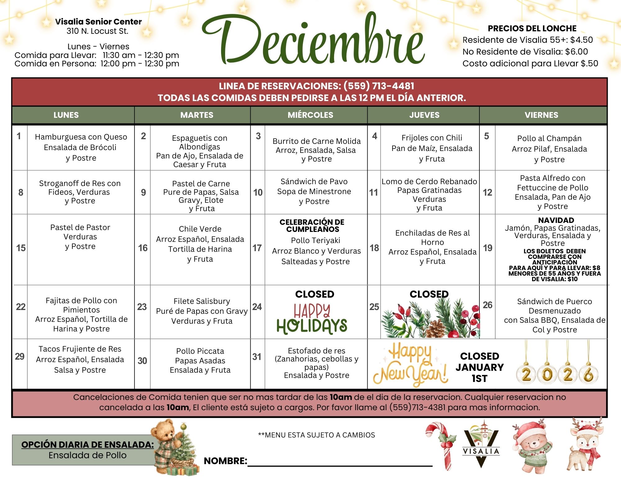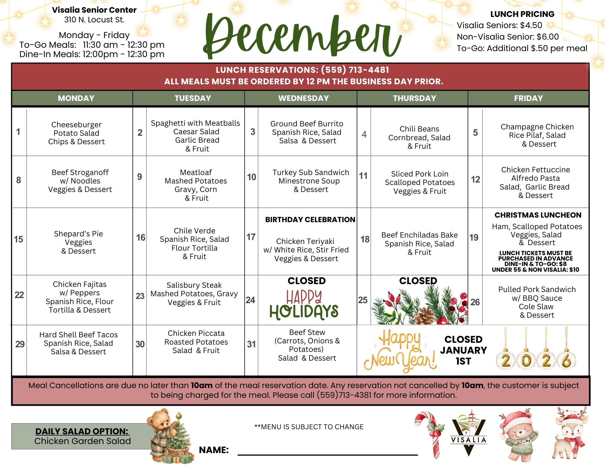 Meals must be reserved in advance. Reservations are due no later than 12 p.m. the business day prior to the lunch you are ordering. Cost is $4.50 for Visalia residents age 55+ and $6 for all other meals.